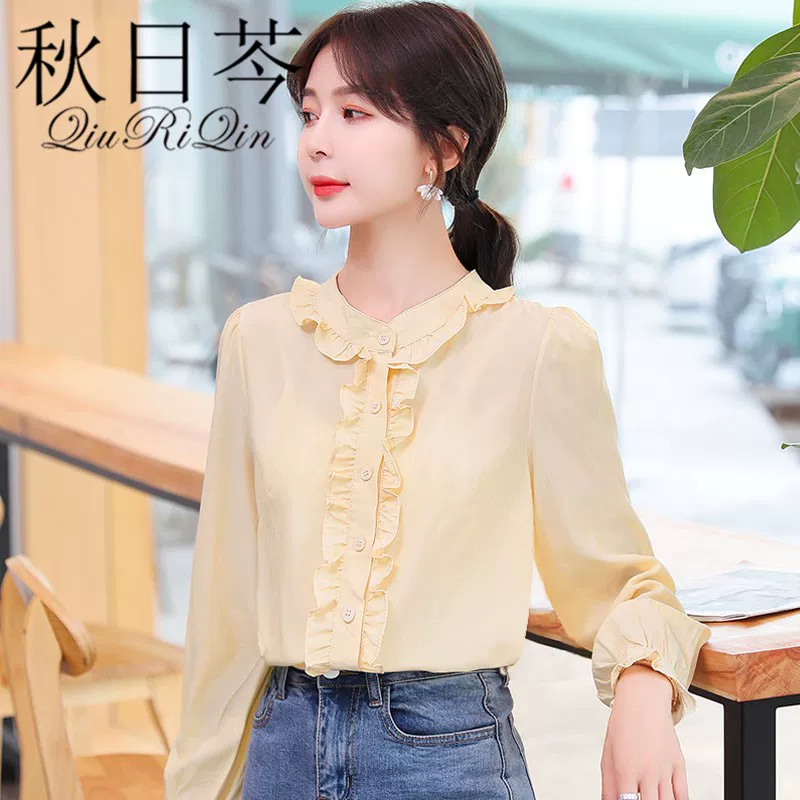 Cổ búp bê dễ thương ~ áo sơ mi nữ nữ 2021 xuân mới áo sơ mi dài tay mộc nhĩ - Áo sơ mi dài tay