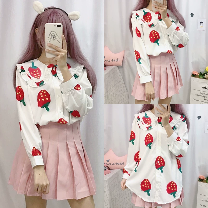 Plus size nữ ngọt ngào tất cả các kết hợp áo khoác học sinh búp bê dâu tây dễ thương cổ áo sơ mi dài tay béo mm200 kg - Áo sơ mi dài tay