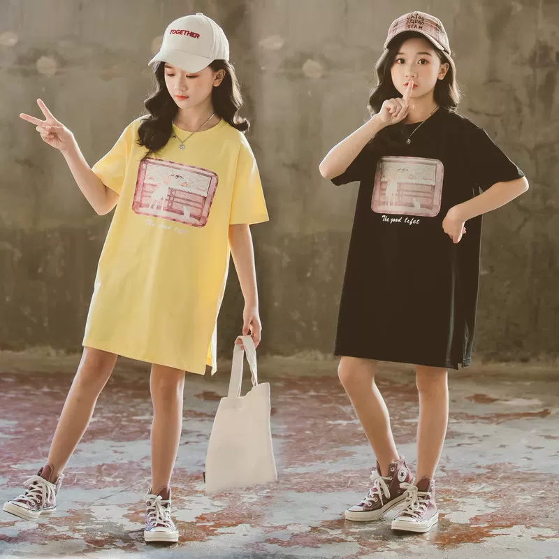 Cô gái áo thun dài giữa mùa hè áo ngắn tay trẻ em mới, trẻ em lớn thời trang cotton tinh khiết áo sơ mi đáy rộng - Áo thun
