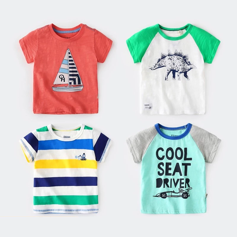 Quần áo trẻ em Moxi trẻ em cotton in hình khủng long mới cho bé trai mùa hè 2019 kiểu nước ngoài Áo sơ mi ngắn tay Hàn Quốc - Áo thun