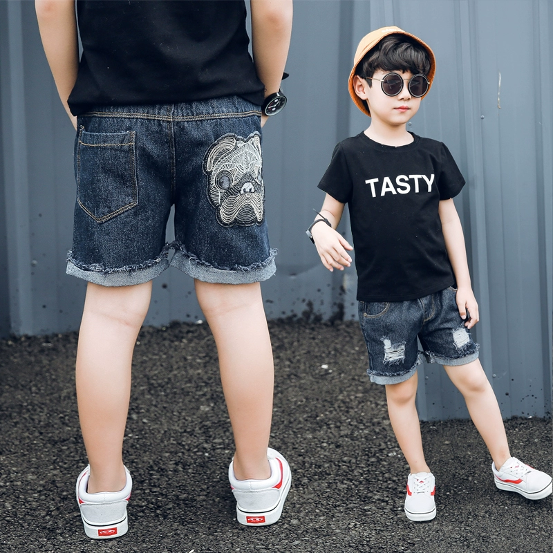 Quần đùi bé trai mùa hè, mỏng, rộng rãi, quần áo trẻ em cỡ lớn, quần năm điểm, lỗ, quần jean trẻ em, triều phong cách hàn quốc - Quần jean