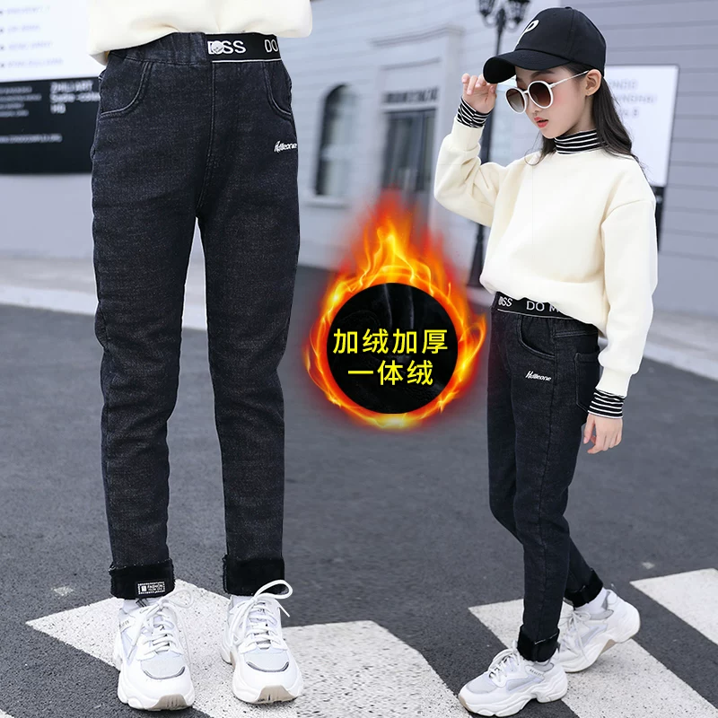 Cô gái cộng với quần nhung để mặc quần áo mùa đông và mùa đông 2019 cho trẻ em lớn hơn quần jean lông cừu một mảnh ấm áp - Quần jean