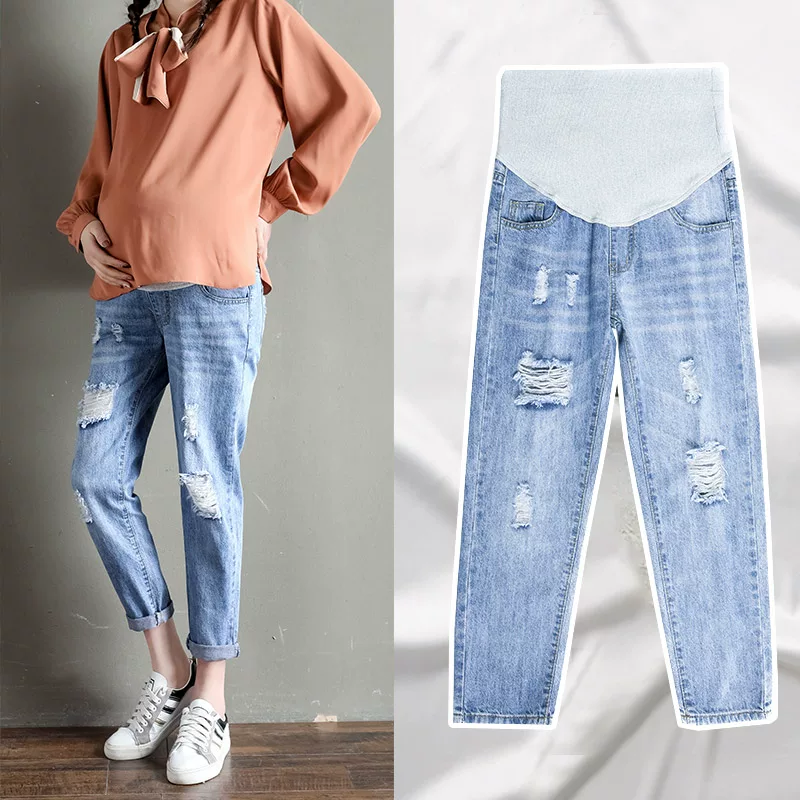 [Giải phóng mặt bằng] Quần dành cho bà bầu, loại mỏng mùa hè, mặc ngoài, áo có lỗ mùa hè, quần jean đáy thẳng thường, quần áo mùa xuân và mùa hè - Phụ nữ mang thai quần / quần bụng