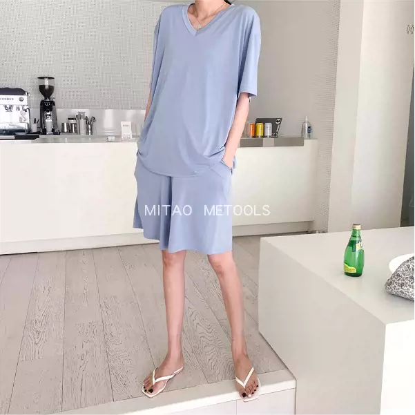 Quần áo bầu ngắn tay, bộ đồ ngủ cho con bú mùa hè, quần áo cho con bú mỏng khi mang thai, bộ đồ phục vụ tại nhà sau sinh rộng rãi - Giải trí mặc / Mum mặc