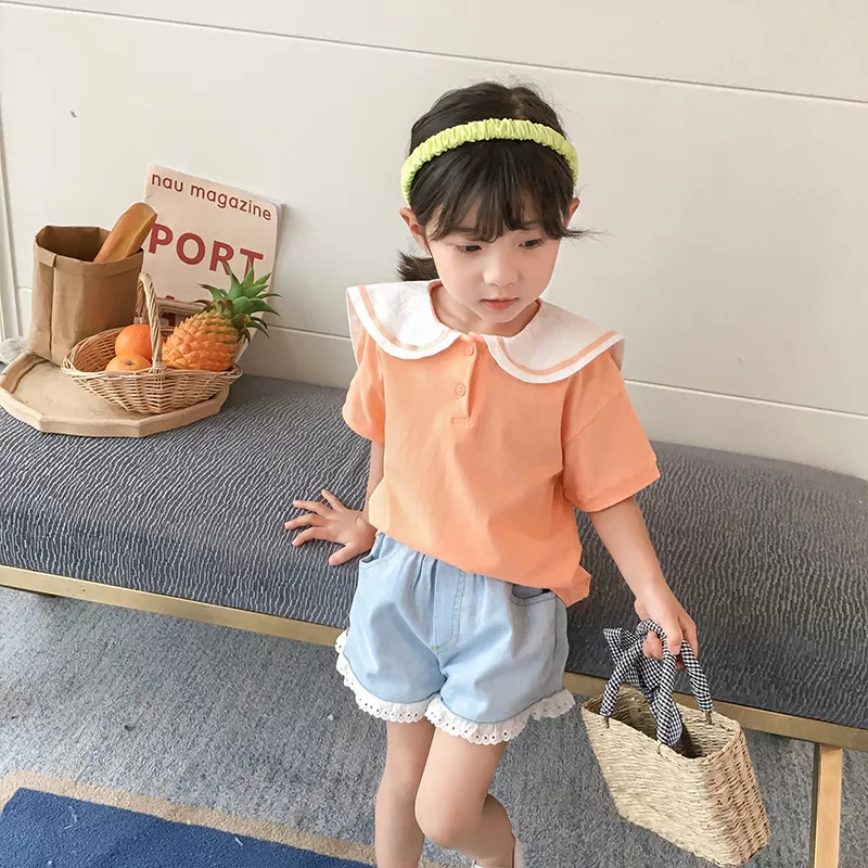 Bé gái áo thun búp bê cổ áo cotton trẻ em mùa hè ve áo màu cam 2020 phiên bản Hàn Quốc của quần áo trẻ em 3 tuổi ngọt ngào - Áo thun