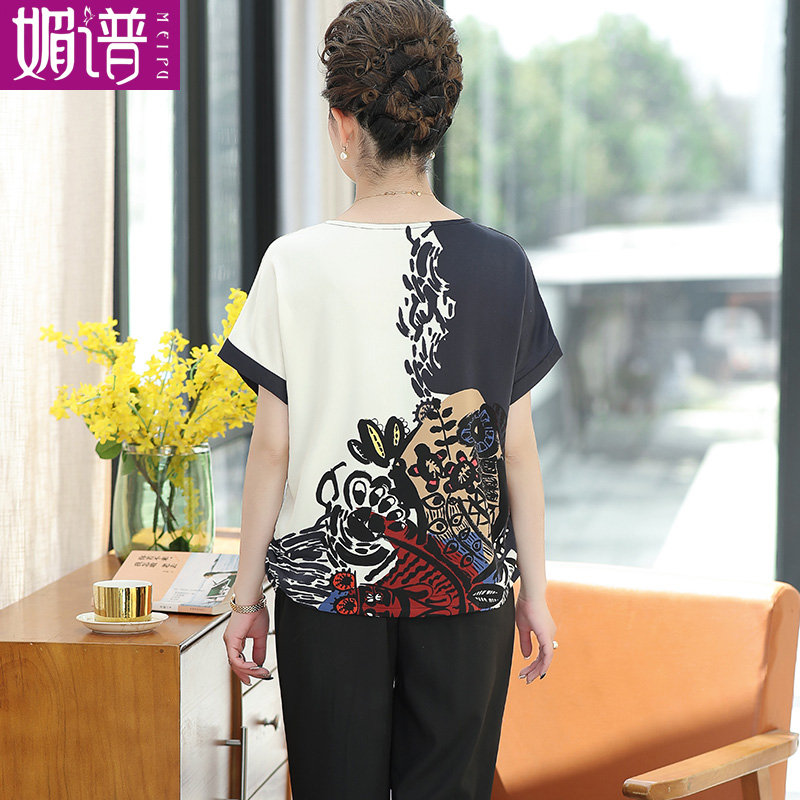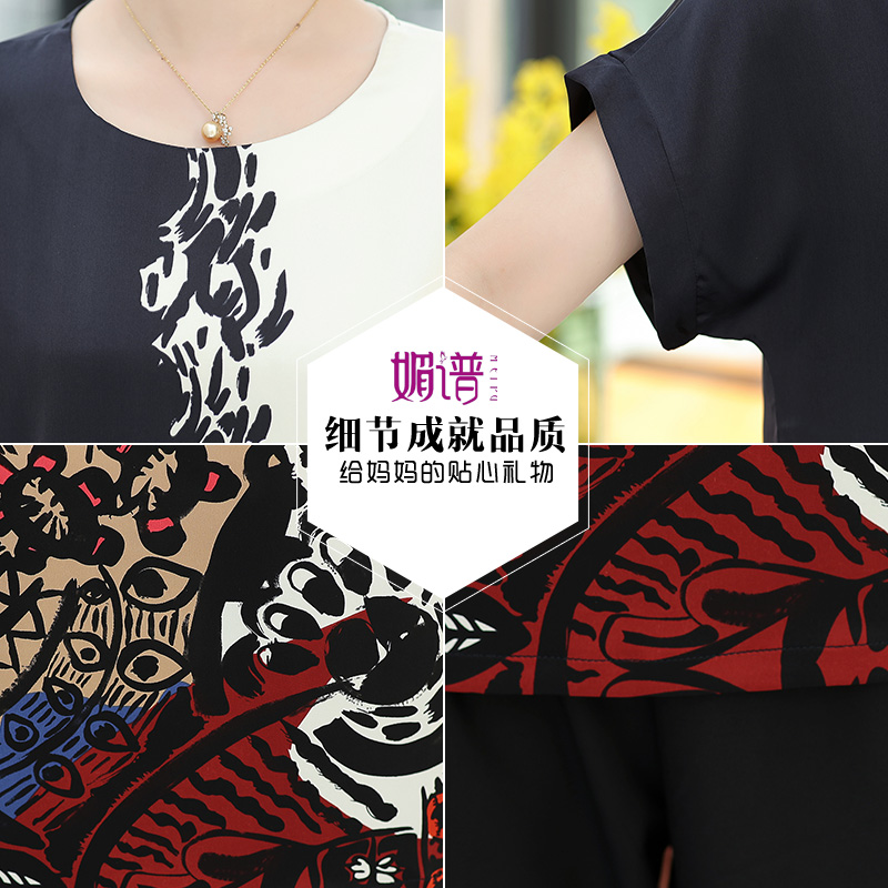 Bộ đồ mùa hè cho mẹ 50 tuổi và phụ nữ lớn tuổi Mùa hè áo thun ngắn tay hai mảnh satin phù hợp với quần áo Ngày của mẹ - Phụ nữ cao cấp