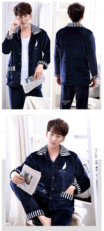 Bộ đồ ngủ flannel mùa thu và mùa đông của nam giới áo nịt lông cừu dày san hô cardigan dài tay bộ đồ phục vụ tại nhà cộng với kích thước phim hoạt hình dễ thương - Bộ Pajama
