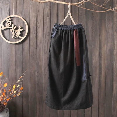 Bức tranh tiếp tục cộng với kích thước cổ điển vá vá khâu nút đĩa váy mùa xuân và mùa thu cộng với kích thước bông và vải lanh thun lưng dài váy - Váy