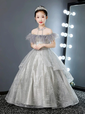 Cô gái cao quý màu xám bạc sưng phồng công chúa người mẫu catwalk váy sinh nhật cho trẻ em váy biểu diễn piano - Váy trẻ em