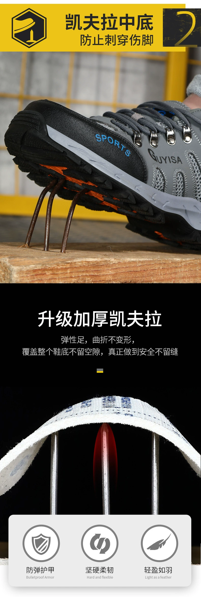 "Chức năng sản phẩm: giày bảo hiểm lao động, có thể nhìn thấy phần mũi giày, và phần gót cũng phải chống đâm Chất liệu bề ngoài: bề ngoài vẫn rất thời trang, hai bên cũng có lỗ thông gió Dễ dàng uốn cong Đôi giày là một phiên bản tương đối lỏng lẻo, và cảm giác bản thân tương tự như giày thể thao hàng hiệu, và không có áp lực lên bàn chân béo."