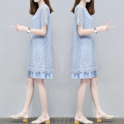 Mùa hè 2020 phụ nữ mới váy ren xanh dài dài cổ rộng thả lỏng voan xếp li nữ - váy đầm