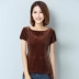 Năm 2020 mùa hè mới một dòng cổ áo trên cùng màu vàng nhung ngắn tay áo thun của phụ nữ áo sơ mi dưới cùng mỏng và mỏng quần áo phụ nữ màu đồng nhất - Áo phông
