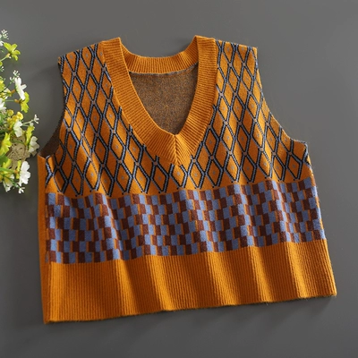 Phiên bản Hàn Quốc mới của chiếc áo vest dệt kim cổ chữ V ngắn hoang dã của phụ nữ mặc ngoài bình thường màu sắc hình kim cương phù hợp với áo ghi lê lỏng lẻo hợp thời trang - Áo vest