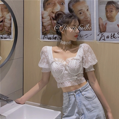 Phụ nữ voan vuông rỗng mùa hè thiết kế ngắn tay cảm giác mới 2020 niche ren cổ áo sơ mi áo sơ mi - Áo sơ mi chiffon ren
