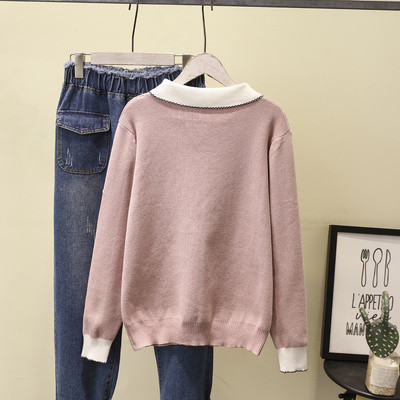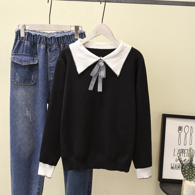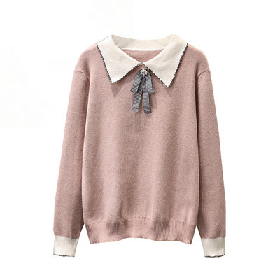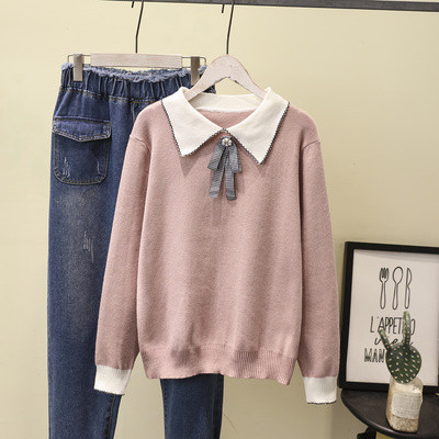 Quần áo phụ nữ Plus fat plus size 20 mùa thu Hàn Quốc rộng rãi béo mm ve áo hit màu nơ áo len trên 200 kg - Áo len thể thao / dòng may