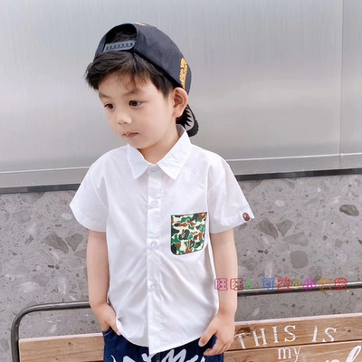 Quần áo trẻ em BAPE áo sơ mi nam mùa xuân và mùa thu thương hiệu thời trang nước ngoài lớn bé trai vượn đầu ngụy trang áo sơ mi ngắn tay - Áo sơ mi