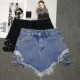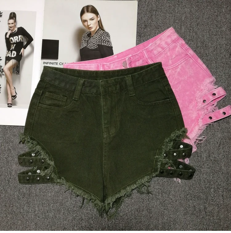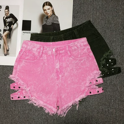 Quần short denim màu hồng nữ mùa hè mới học sinh rộng quần ống rộng eo cao đinh tán rỗng móng tay lỗ lỗ quần nóng - Quần jean