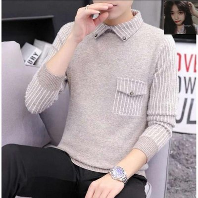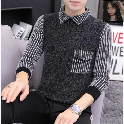 2020 mới ve áo của nam giới giản dị chồn nhung sọc dệt kim cổ áo sơ mi giả hai áo len 1 - Áo len thể thao / dòng may