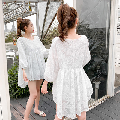 Áo sơ mi búp bê top xòe phiên bản Hàn Quốc rộng rãi và ngọt ngào màu trung đầm voan dài ngang eo che bụng siêu tuổi - Áo sơ mi chiffon ren