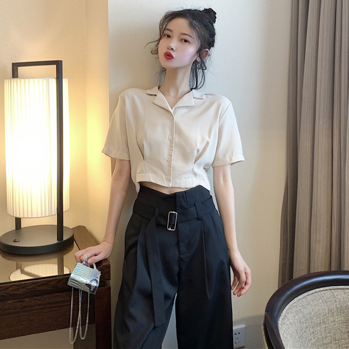 Áo sơ mi nữ phong cách Hồng Kông có thiết kế phù hợp với phụ nữ mùa hè retro Hương vị Hồng Kông ngắn tay Hàn Quốc lộ ra rốn ngắn - Áo sơ mi