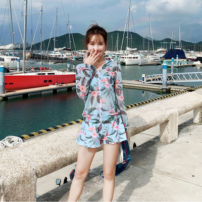 Áo tắm bầu trời xanh nữ bốn mảnh bảo thủ che bụng giảm béo 2019 fan cổ tích mới theo phong cách Nhật Bản tay dài xẻ tà - Bộ đồ bơi hai mảnh