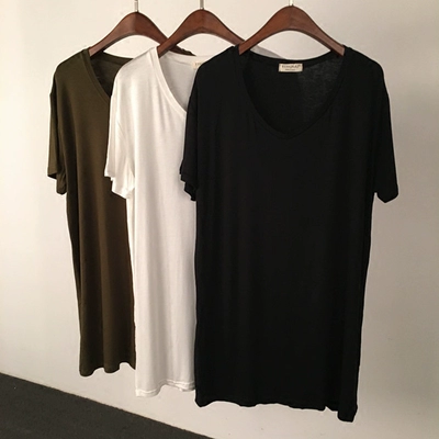Áo thun dài trung bình phương thức của phụ nữ mùa hè phong cách châu Âu và Mỹ màu rắn cỡ lớn cổ chữ V ngắn tay áo trên - váy đầm