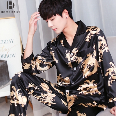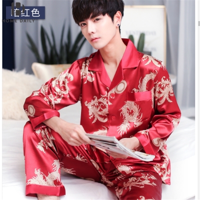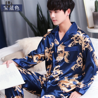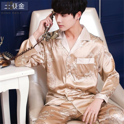 Bộ đồ ngủ bằng lụa thật của nam giới mùa hè rắn màu kích thước lớn thanh niên mùa xuân và mùa thu lụa mỏng dài tay dịch vụ tại nhà Hàn Quốc - Cha mẹ và con