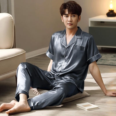 Bộ đồ ngủ lụa lụa mùa hè của nam giới quần dài ngắn tay mỏng mùa hè có thể được mặc bên ngoài bộ đồ phục vụ tại nhà bằng lụa zs - Bên ngoài ăn mặc