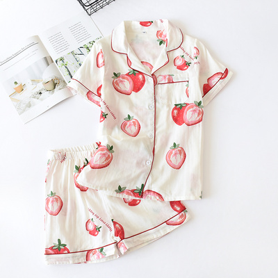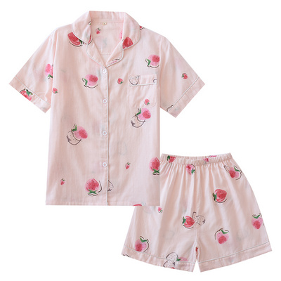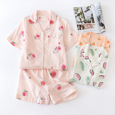 Bộ đồ ngủ nữ mùa hè cotton tinh khiết gạc mỏng ngắn tay quần đùi phục vụ tại nhà phiên bản Hàn Quốc ngọt ngào và phóng khoáng có thể mặc bên ngoài - Bộ Pajama