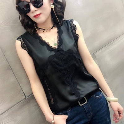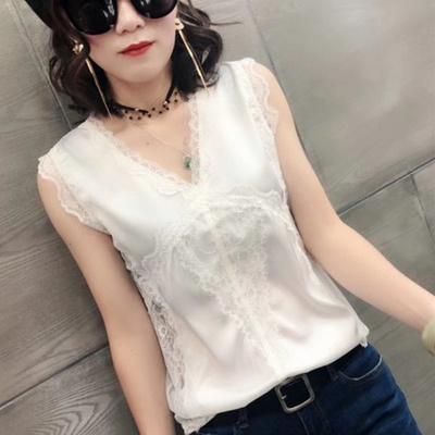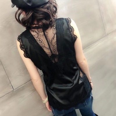 Châu Âu ga mới sexy cổ chữ V satin áo yếm nữ vẻ đẹp trở lại ren không tay áo sơ mi đáy thời trang - Áo vest