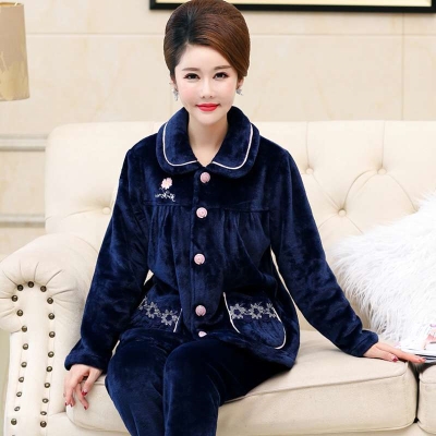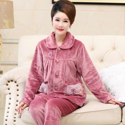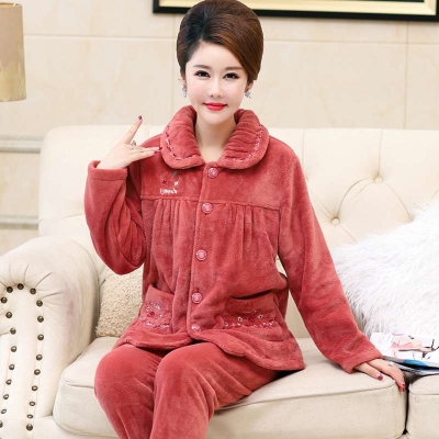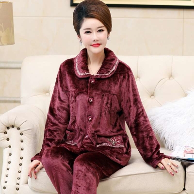 Đồ ngủ nữ mùa thu và mùa đông san hô dày lông cừu bà mẹ trung niên và cao tuổi flannel ấm áp kích thước lớn bộ nhà - Pyjama