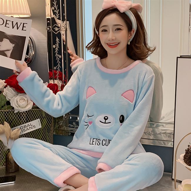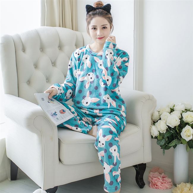 Đồ ngủ sang trọng của phụ nữ dài tay lông cừu dày san hô quần áo mùa thu và mùa đông thanh thiếu niên học sinh trung học cơ sở học sinh trung học bộ đồ flannel - Bộ Pajama