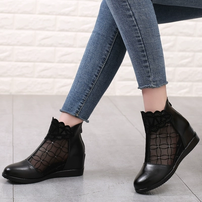Giày cao gót da bò thật lưới da bò ngắn của phụ nữ mùa xuân và mùa thu da bên trong giày cao gót đơn giày cao gót giữa mẹ giày lưới giày ống rỗng thoáng khí - Kính đeo mắt kính