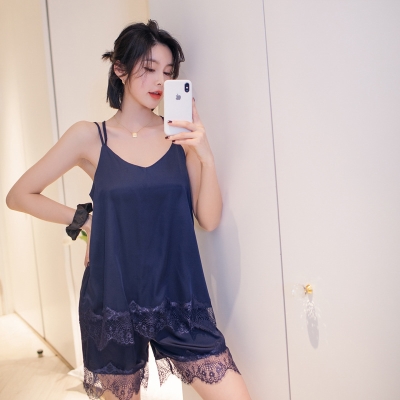 Hồng Kông Mùa hè ren sexy Bộ đồ ngủ nữ lụa hai mảnh Bộ đồ mặc nhà lụa mỏng cho nữ Hàn Quốc - Bên ngoài ăn mặc