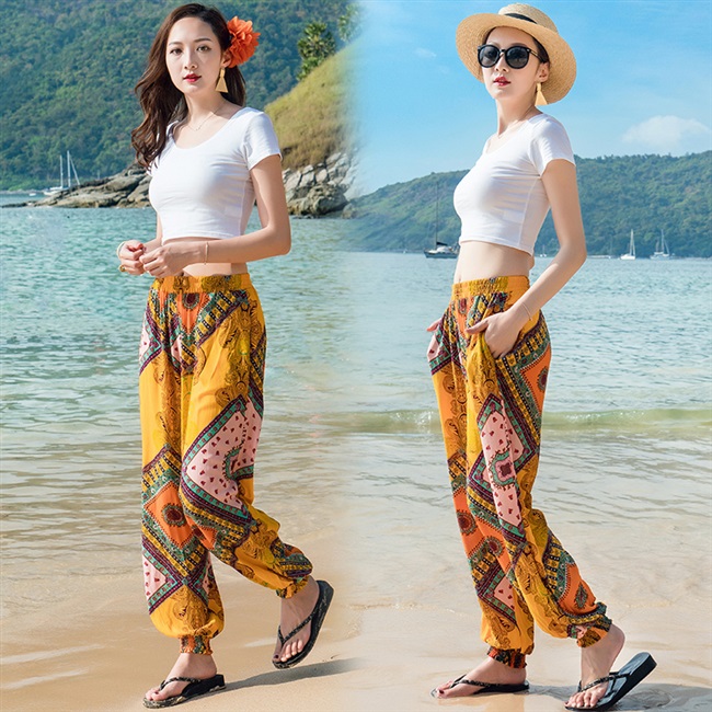 In quần dài đi biển Bohemia nữ người dân tộc Bali áo cánh rời quần harem phù hợp với lụa cotton - Quần bãi biển