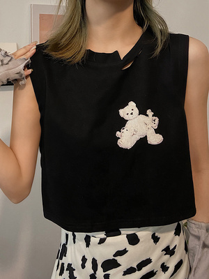 Lương thập cẩm kim chi mix áo khoác dạ hè đen dạo phố phiên bản Hàn Quốc gấu in áo không tay rời mặc trong vest nữ - Áo vest