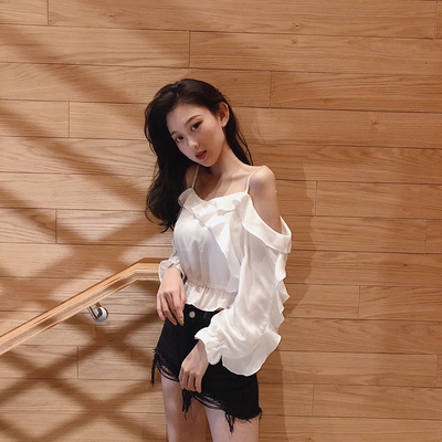 Mùa thu mới dài tay một bên xù lông lệch vai áo sơ mi voan ngắn áo sơ mi dáng xòe nữ tính - Áo sơ mi chiffon ren