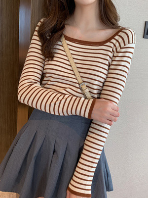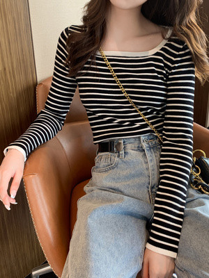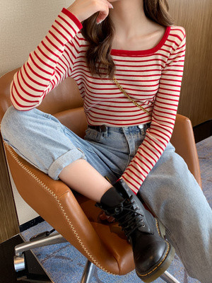 Mùa xuân và mùa thu 2020 phong cách áo len sọc mới, cổ áo vuông, áo sơ mi mỏng, phần ngắn, hàng đầu, áo len, phụ nữ - Áo / áo thun