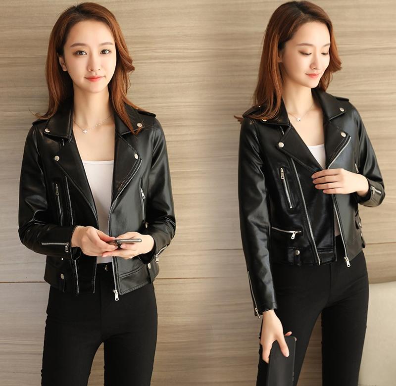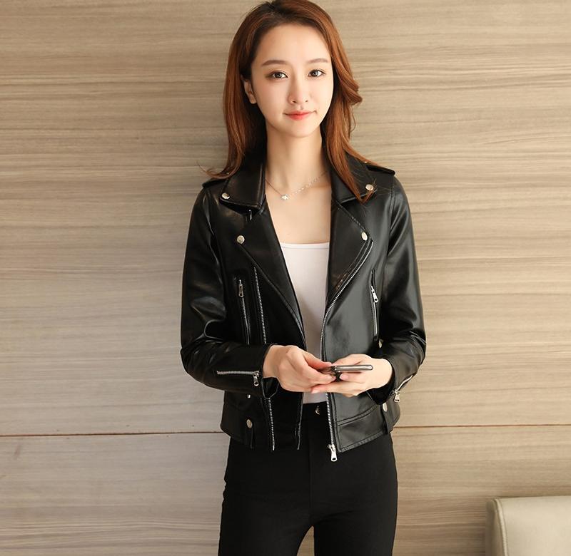 . Mùa xuân và mùa thu mới pu da nữ nhỏ áo khoác ngắn đầu máy màu đen giản dị phụ nữ mỏng ví cao eo - Quần áo da
