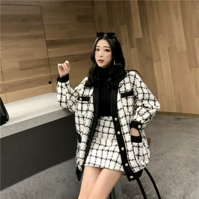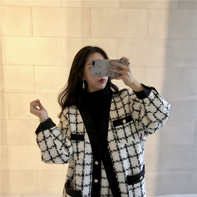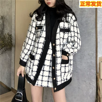 Phong cách phương Tây lưới đỏ học sinh kẻ sọc áo choàng len lỏng áo khoác nữ mùa xuân nhỏ nước hoa váy hai mảnh phù hợp với thủy triều - Áo len lót đôi