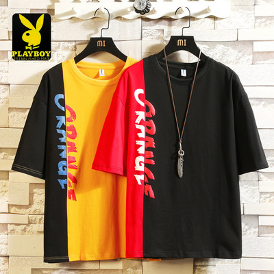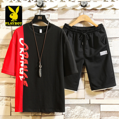 Playboy lưới màu đỏ giản dị bộ đồ thể thao nam triều thương hiệu bộ đồ cotton hai mảnh ngắn tay năm điểm cho nam giới mùa hè - Bộ đồ