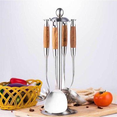 Thìa thép không gỉ 304 mới dụng cụ nhà bếp thìa xẻng bộ xử lý bằng gỗ xẻng rán xẻng rán - Phòng bếp