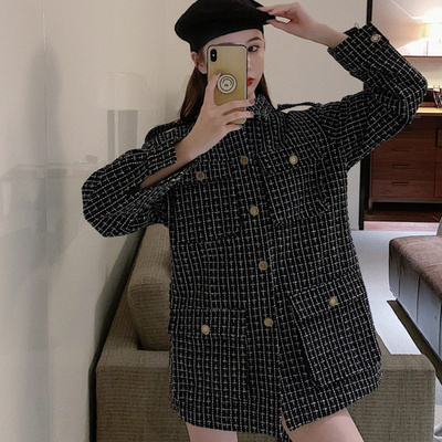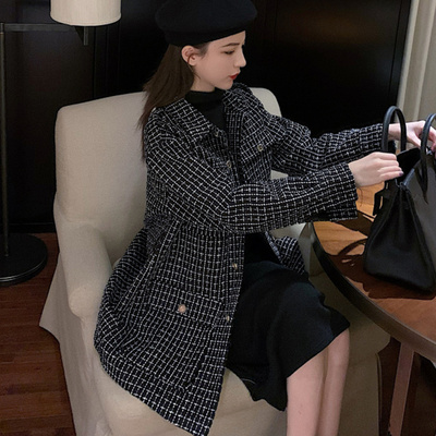 Thiết kế màu tương phản kiểm tra băng len áo khoác nữ 2019 mùa thu và mùa đông mới retro áo dài tay giữa dài - Áo khoác dài