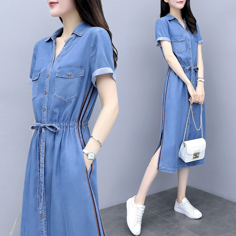 Váy denim mùa hè 2021 mới của phụ nữ có độ dài trung bình áo sơ mi dài váy dài mùa hè giản dị váy mỏng - váy đầm