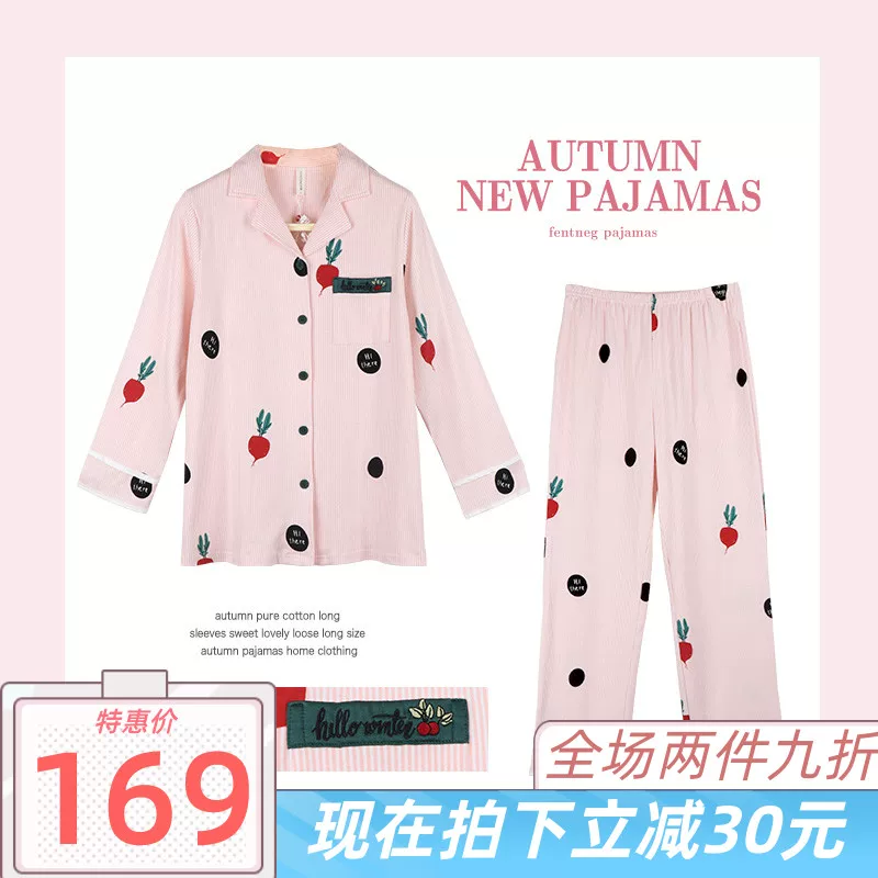 Fenteng đồ ngủ của phụ nữ mùa xuân và mùa thu phong cách mới cotton tinh khiết dài tay quần dài cardigan ngọt ngào và đáng yêu dịch vụ tại nhà J88030237 - Giống cái