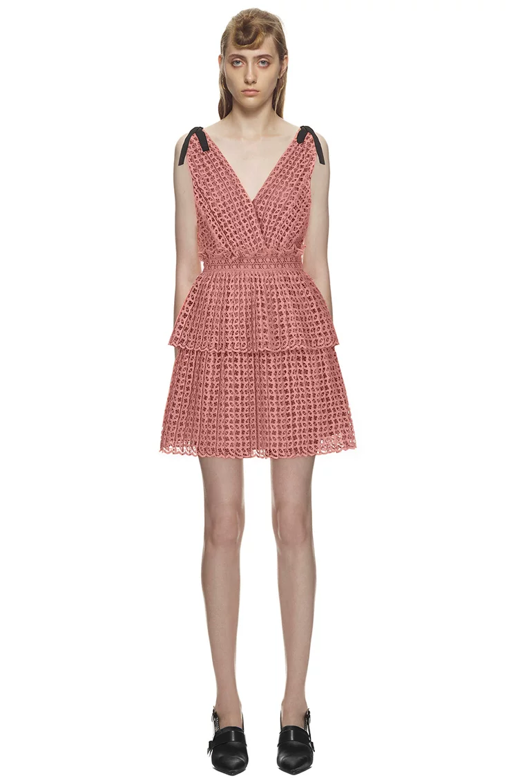 2938 # Thời trang mới mùa hè ren mỏng rỗng eo cao cổ chữ V Dây đeo ren cho phụ nữ Váy ngắn - Váy eo cao