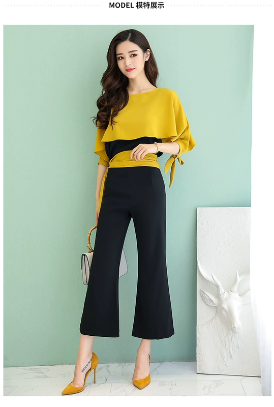 Deep Yidu 2019 hè mới size lớn hai mảnh phù hợp với mùa hè thời trang áo sơ mi tay ngắn quần ống loe 1805 - Bộ đồ