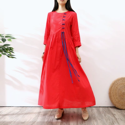 Mùa xuân và mùa hè mới cổ tròn cotton và vải lanh của phụ nữ váy dài trung niên văn học cổ điển lưng cao váy dài phong cách dân tộc mùa thu của phụ nữ - Váy eo cao