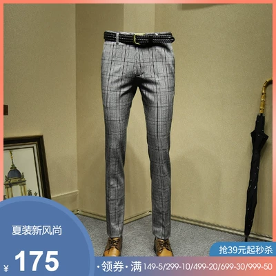 DANDY HOMME mùa thu đông kẻ sọc phù hợp với quần nam tự kinh doanh thanh niên giản dị chân nhỏ quần hơi co giãn - Suit phù hợp