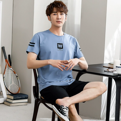 Dịch vụ mặc nhà mùa hè ngắn tay phong cách Hàn Quốc đồ ngủ hai mảnh tươi mát quần đùi nam ngắn tay cotton tinh khiết thể thao - Cha mẹ và con